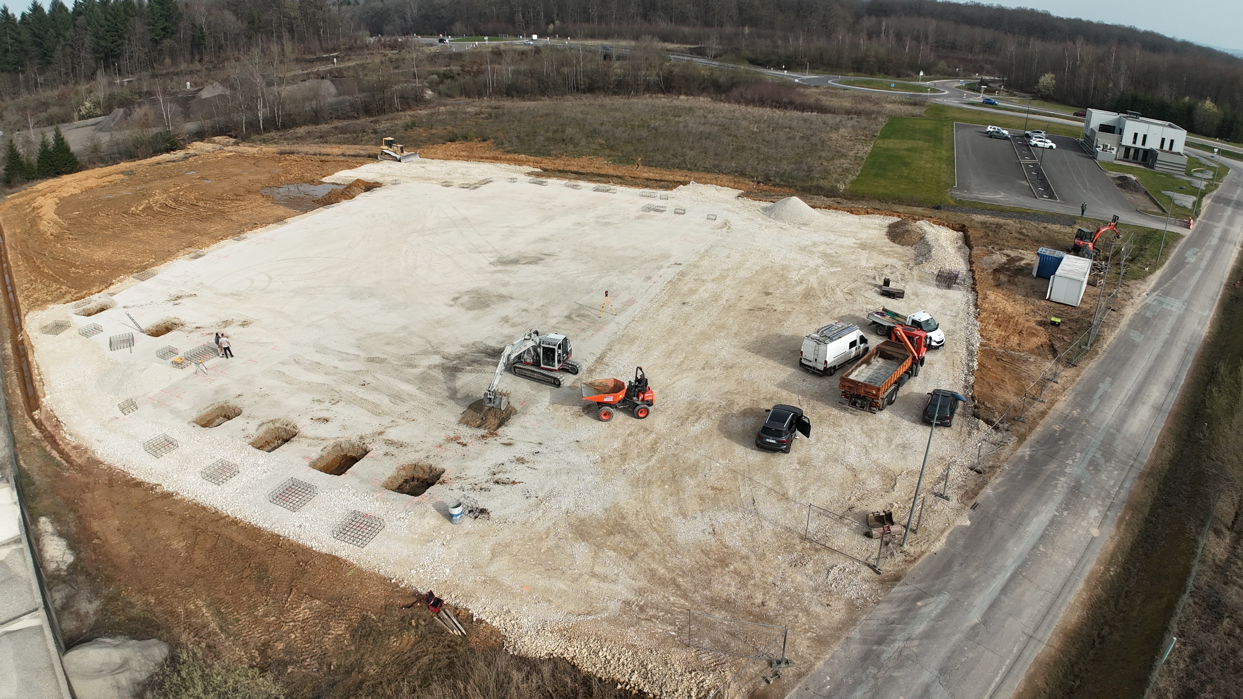 Travaux effectués : Installation de chantier, panneau de chantier, études béton armé, implantation, plateforme, fouilles en rigoles, Fouilles en trous, fondations, ouvrages en béton armé, dallage, élévations, isolation thermique, réseaux enterrés, …