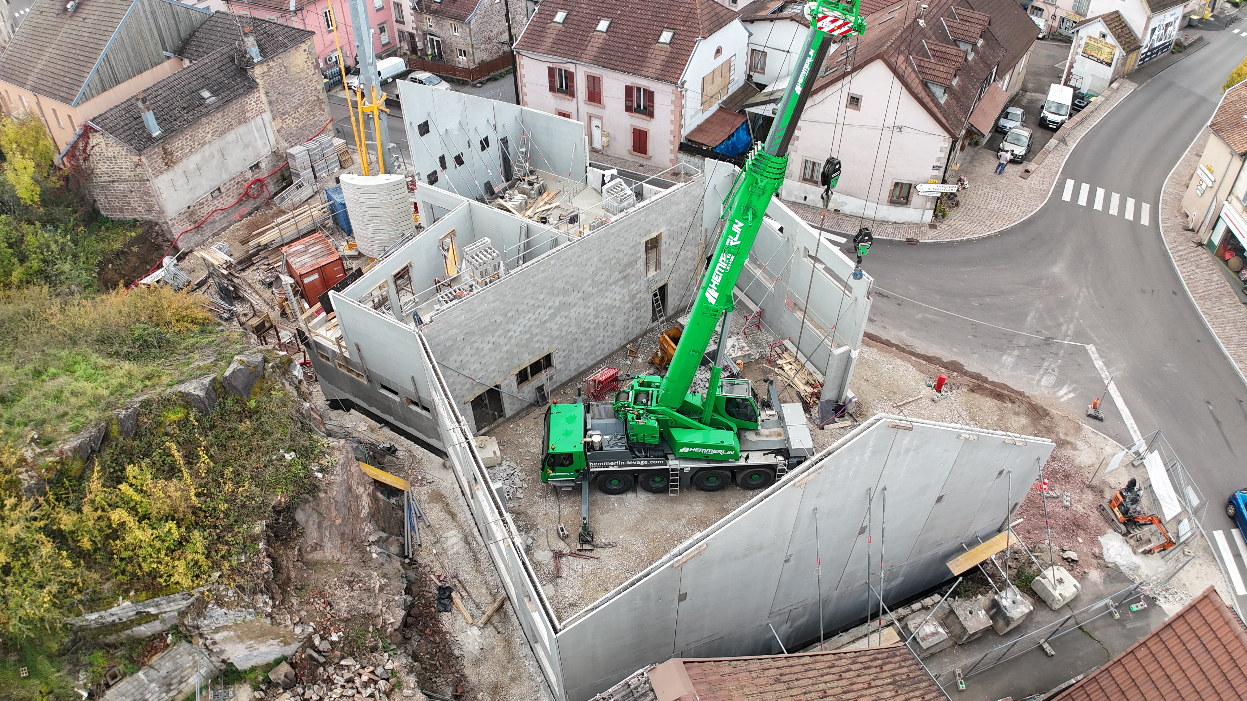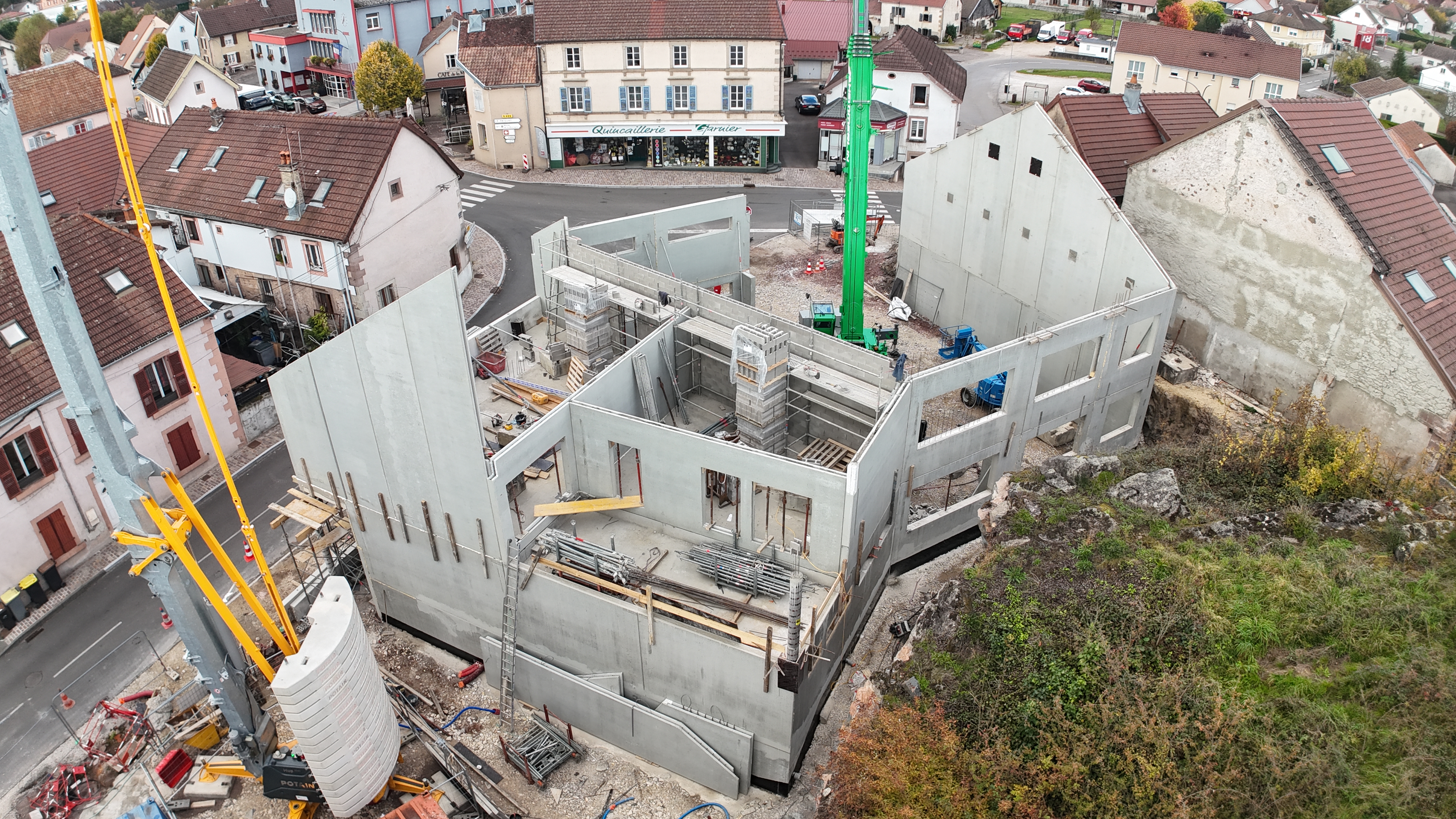 Travaux effectués : Installation de chantier, panneau de chantier, études béton armé, implantation, fouille en rigole, fouille en trous, Fondations, Ouvrages en béton armé, Mise à la terre, maçonnerie, Dallage, Fourniture et mise en place de dalle en béton armé, réseaux enterrés, réalisation d'un escalier en béton armé,…